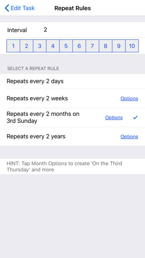• Create repeating tasks, daily, weekly, monthly and more complex repeat rules if required