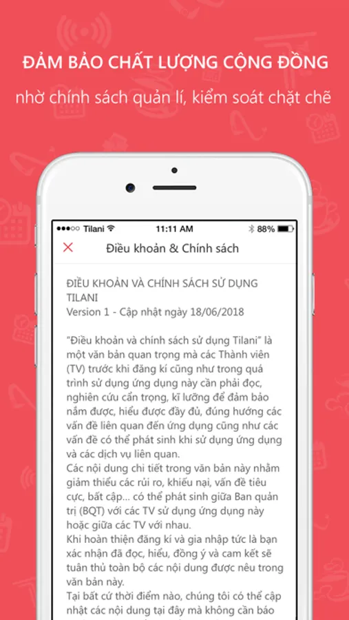 - Cam kết tuân thủ Điều khoản, chính sách và các chuẩn mực ứng xử mà Ban Quản trị của ứng dụng Tilani đề ra cũng như các nguyên tắc ứng xử văn minh lịch sự theo chuẩn mực chung của
