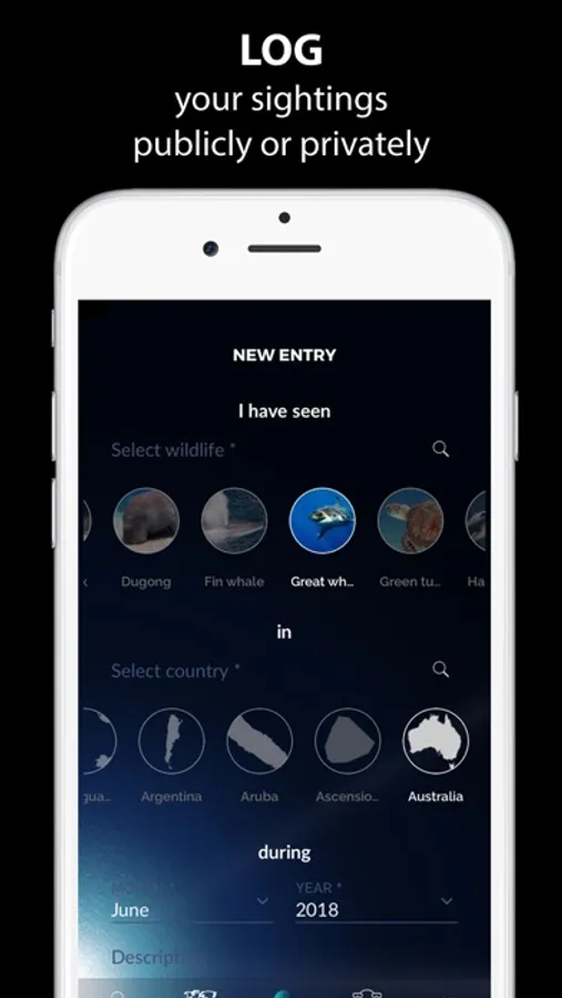 Keep track of your marine wildlife experiences on your own personal map. Add your sightings by selecting an animal, time of year and country. Take the opportunity to report on the environmental situation at the dive site (e.g. marine debris, corals in distress, etc.).