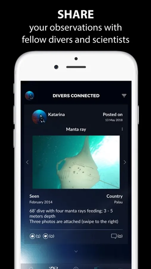 Divers Connected serves as a social platform for divers all around the world to share their experiences publicly. Check what other divers are logging and participate in building a database of sightings, which could help marine scientists in their research.