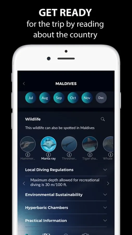 Once you select a desired country, the Country Page shows the types and locations of other marine life likely to be spotted in that country. The page also includes valuable information like local diving regulations, environmental sustainability recommendations, a list of hyperbaric chambers and more.