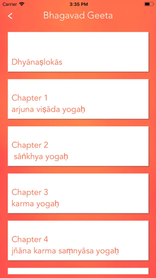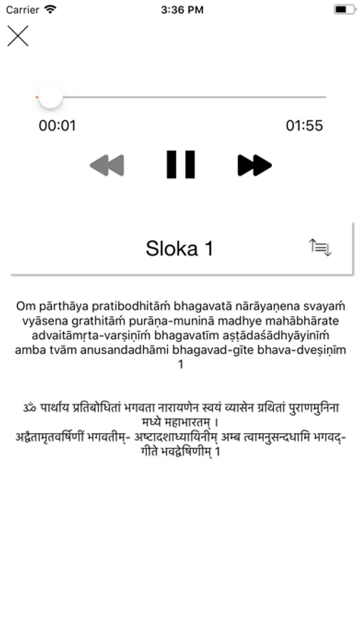 It displays each verse of Bhagavad Geeta accompanied by the audio that is repeated couple of times so that the listener can learn how to chant them properly.