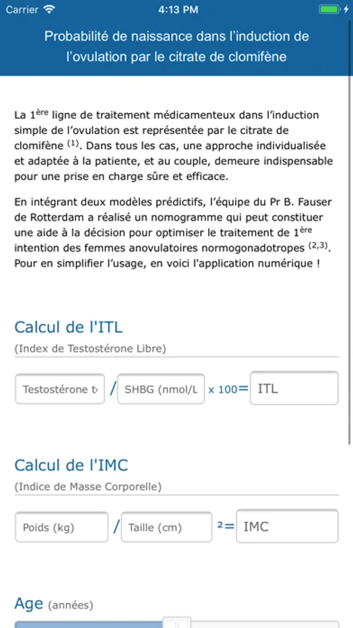 En intégrant deux modèles prédictifs, l’équipe du Pr B. Fauser de Rotterdam a réalisé un nomogramme qui peut constituer une aide à la décision pour optimiser le traitement de 1ère intention des femmes anovulatoires normogonadotropes (2,3). Pour en simplifier l’usage, en voici l'application numérique !
