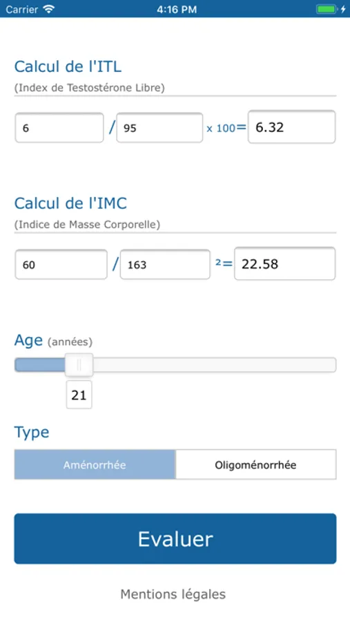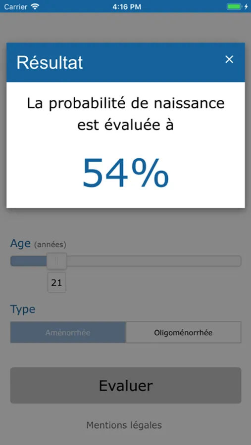 Les résultats calculés par cette application sont présentés à titre indicatif, et reposent sur des probabilités avec une marge d'erreur. Ils ne sauraient se substituer à un avis médical. Par ailleurs, cette application ne peut en aucun cas être utilisée comme méthode contraceptive.