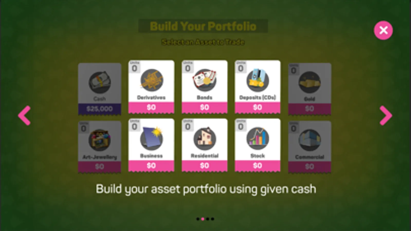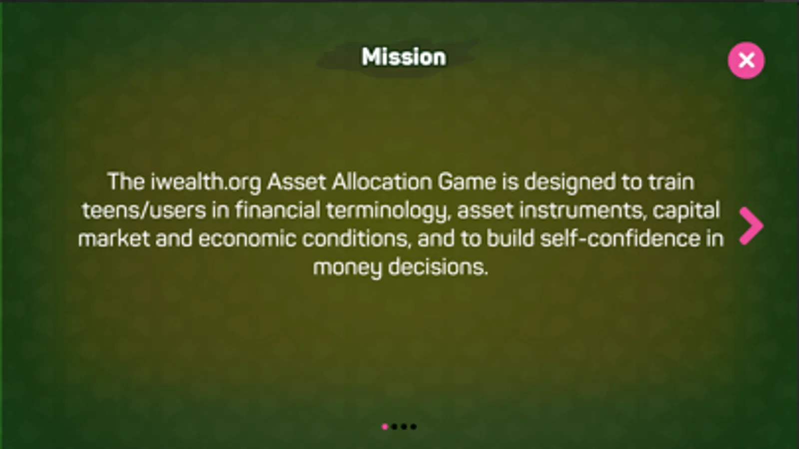 The iwealth.org Asset Allocation Game is designed to train teens/ users in financial terminology, asset instruments, capital market and economic conditions, and to build self-confidence in money decisions. This basic level game trains users to buy and sell assets confronted by various changing macro-economic conditions.