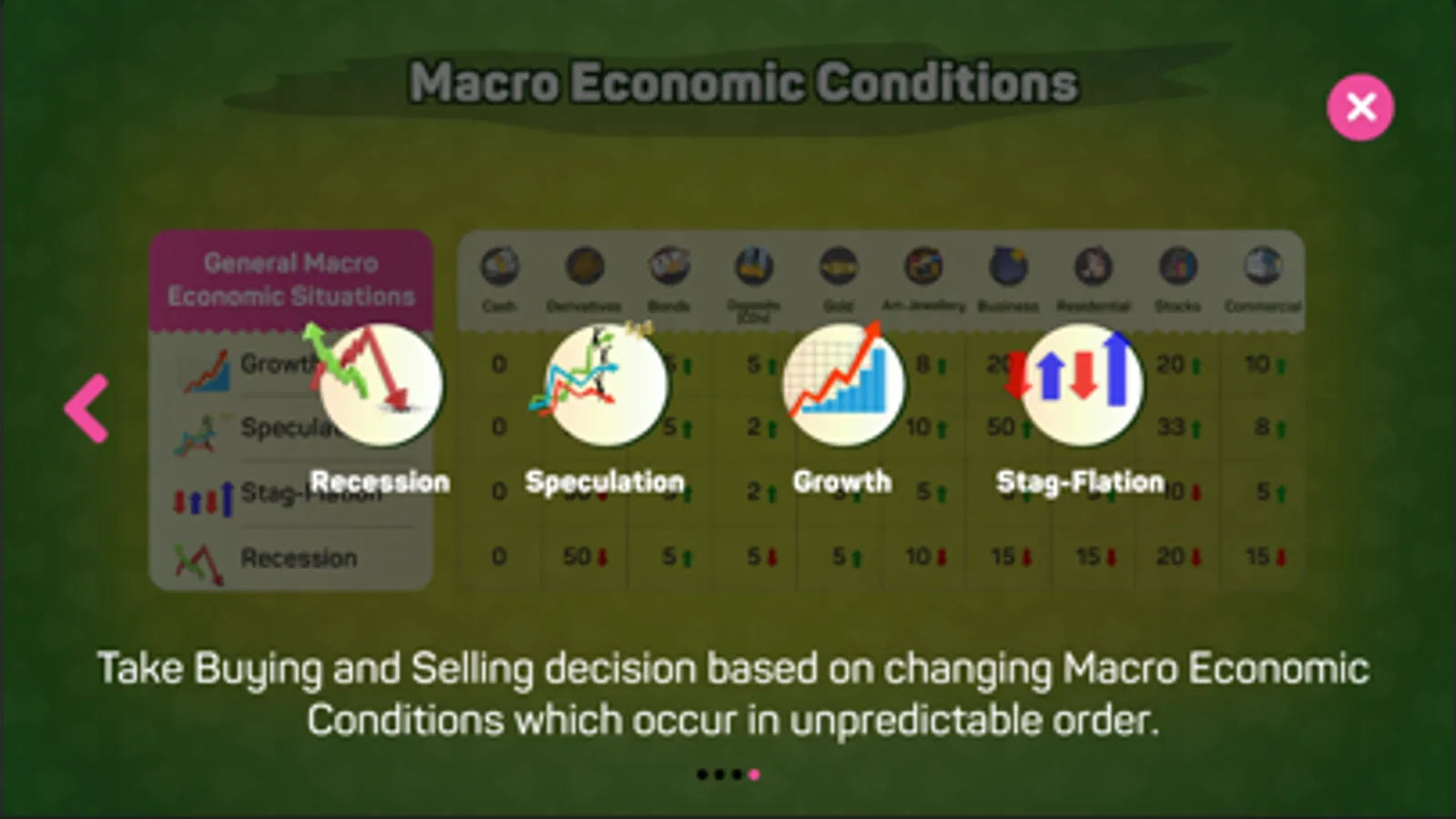 Each player takes a turn to allocate cash into various Asset classes based upon Par Value in Year 0. Assets are purchased from the Central Bank. Once all players complete their buying decisions, then one of four (1 of 4) Macro Economic Conditions (MEC) occurs to modify the Par Values into new Market Values for each Asset – some assets gain in money while others show negative results.