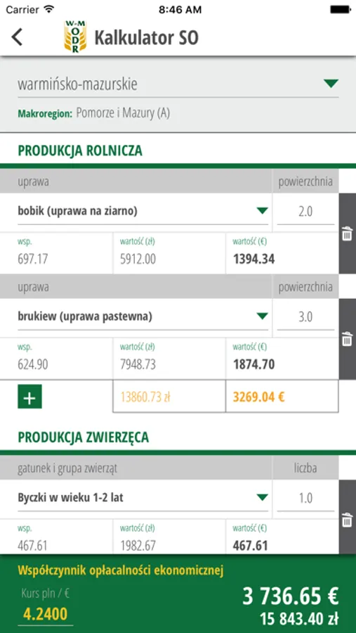 Moduł „Zasoby” - pozwala na wprowadzenie terminów atestacji opryskiwaczy oraz terminów polis ubezpieczeniowych. O zbliżających się terminach upływu ważności wymienionych, Użytkownik będzie informowany przez aplikację z wyprzedzeniem dwu-, jednomiesięcznym oraz tygodniowym. Moduł zawiera również kalkulator opłacalności ekonomicznej gospodarstwa rolnego, prognozę pogody pokazywaną na podstawie aktualnej lokalizacji Użytkownika, a także funkcję dodawania notatek tekstowych i głosowych.