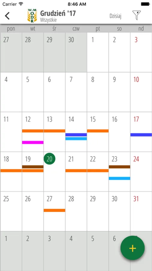 Moduł „Mój kalendarz” - to miejsce, w którym automatycznie zapisane zostają informacje o potwierdzonych spotkaniach z Doradcą, szkoleniach i konferencjach, na które zostały przyjęte zgłoszenia chęci udziału Użytkownika, terminach atestów opryskiwaczy i polis ubezpieczeniowych. Użytkownik może ponadto dodać własne wpisy do kalendarza.