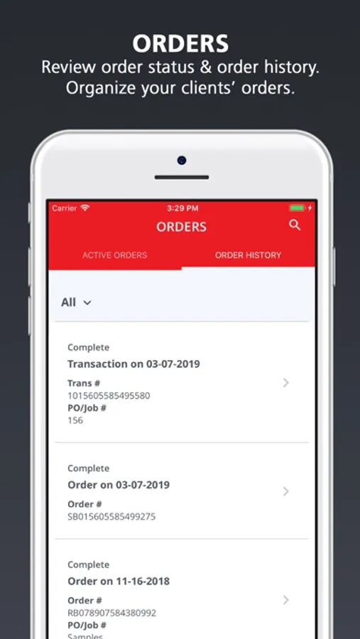 Keep track of old, new, and ongoing orders for jobs. View active orders, review order history, and organize orders by client or job.