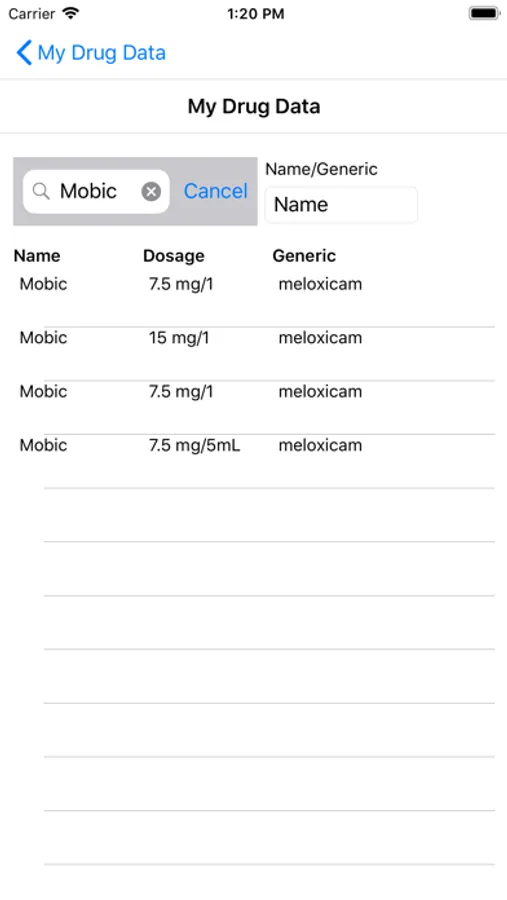 For prescription drug data, tap the Prescription Button. After the data is loaded, which may take a few moments, a grid will appear containing 8,894 drugs sorted by Name, listing also the dosage and the generic name of the drug. You may search the list by Name or Generic Name As you type in the letters of the name, the list is narrowed to those drugs with first letters being the letters you have entered. Type slowly. If you type rapidly, the response may take a while to catch up.