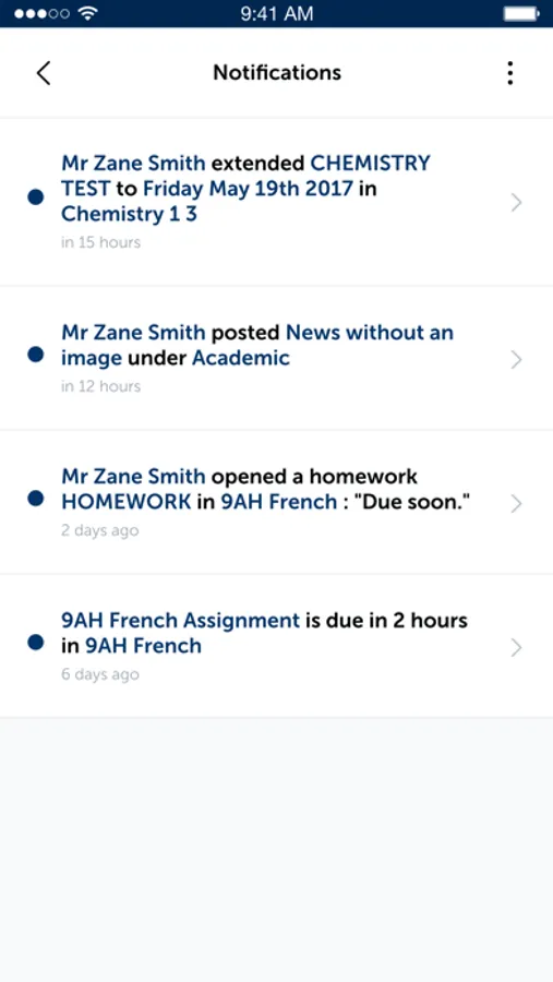 Calendar: the Calendar provides parents, teachers and students a personalised view of what's coming up for the day or in the future. Students can also receive reminders when the due date for their work is approaching