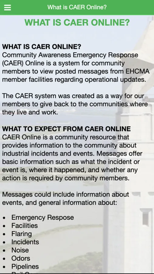 The EHCMA Community Awareness Emergency Response (CAER) Online app provides information to the community about industrial activities.
