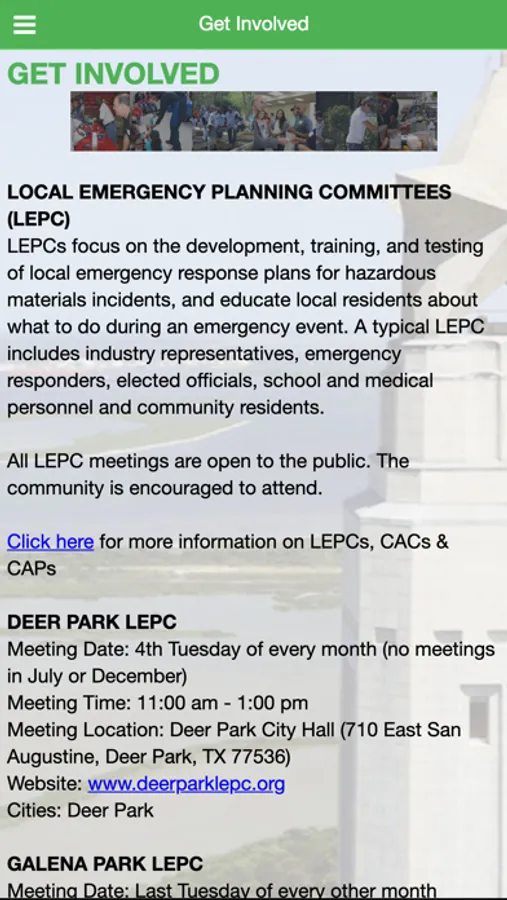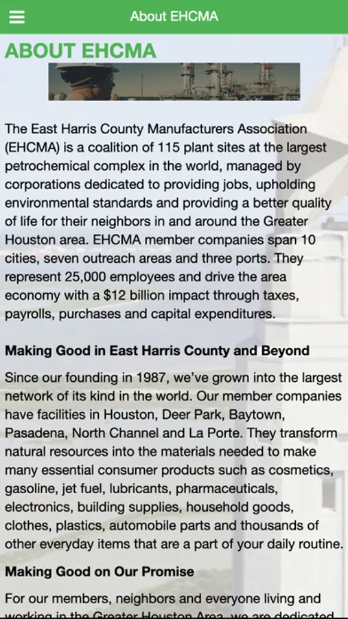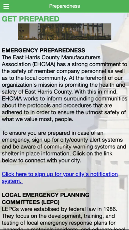 Latest CAER Messages, What is CAER Online?, Preparedness Information and How to Get Involved, How to Connect with your City, Information about the East Harris County Manufacturers Association (EHCMA), including How to Contact EHCMA and Follow EHCMA on Facebook.