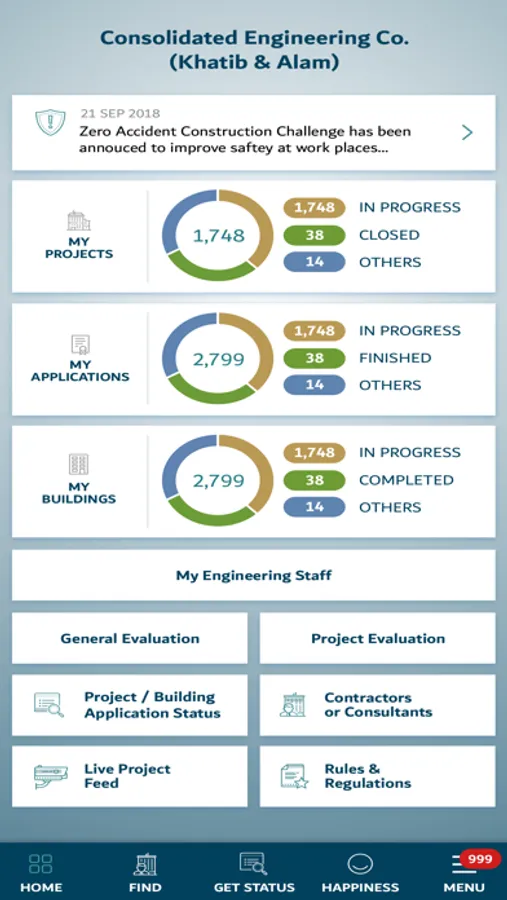 A Smart Mobile application -designed in compliance with the latest international standards- that provides all information related to building permits through innovative methods, Where, contractors, consultants, owners and property developers, in addition to building permits managers can follow up the work stages on construction sites through simply illustrated graphics. Besides, users can follow up building permits applications status, view the engineers notes , pay the fees and book appointments easily, in addition to the provision of large number of reports related to buildings , projects, applications, and KPI’s.
