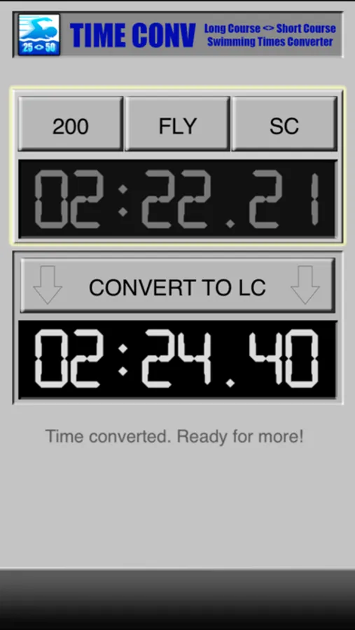 The simplest, fastest, smoothest way to convert a swimming short course time into long course and vice et versa! Uses a proper algorithm based on ASA tables to give you an accurate time.