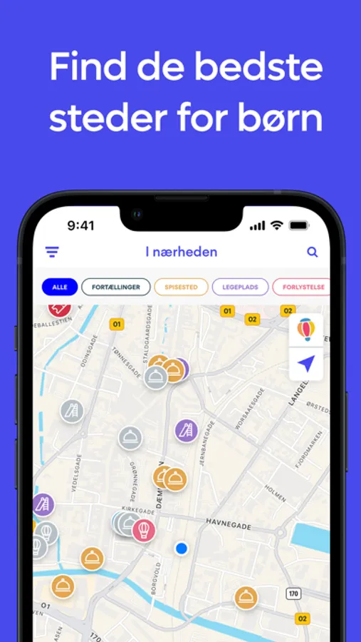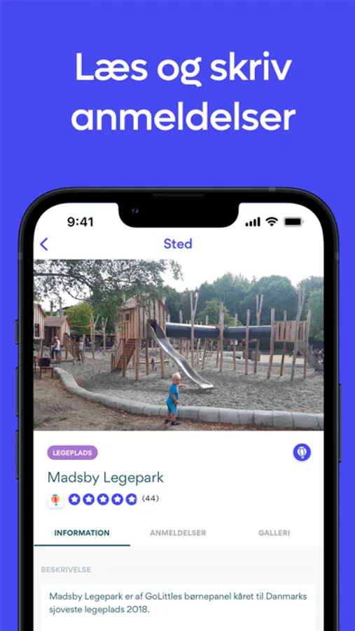 Søg efter steder i nærheden, læs anmeldelser fra andre forældre og tilføj selv steder, som du og ungerne elsker.