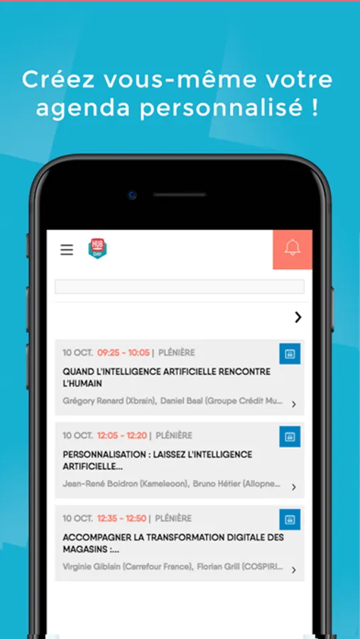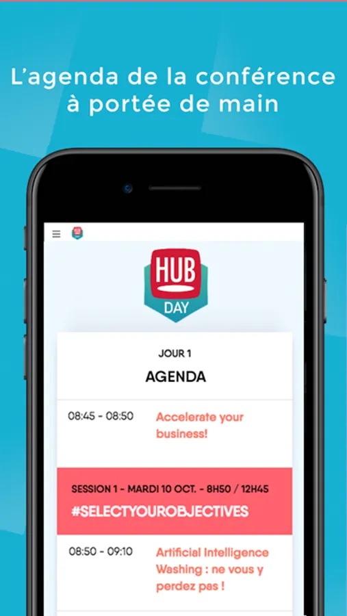- Agenda & Inscription : planifiez votre venue, ajoutez en favoris vos sessions, inscrivez-vous aux workshops et construisez votre agenda personnalisé. Retrouvez l'agenda complet des conférences du HUB Institute : https://hubinstitute.com/conferences