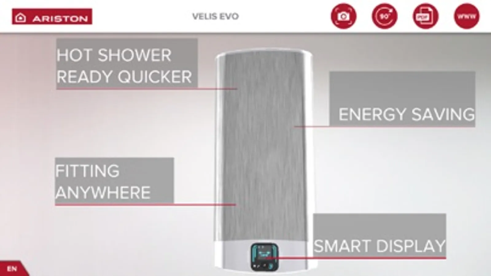 With Velis Evo in augmented reality, you will have the opportunity to have a real image of your electric water heater at any angle without having to purchase and install it. Print and stick the marker at the intended location of Velis Evo and look at it through the screen of your smartphone or tablet. You will then see three-dimensional Velis Evo on the selected background