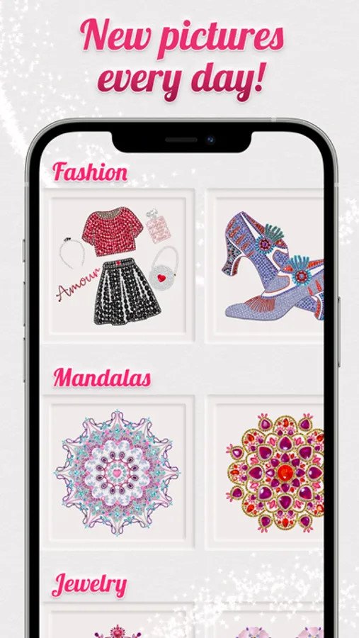 • Family-friendly content: color anti-stress Dazzly pictures of mandalas, animals, jewels, and much more.