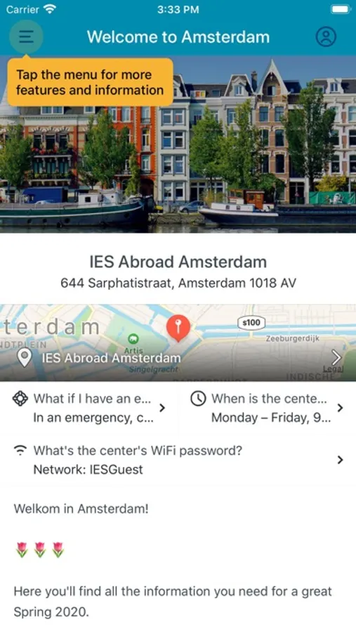 The IES Abroad app is an exciting way to engage during your study abroad experience with resources at your fingertips. It allows you to view schedules, maps, cultural opportunities, important contacts and the most up-to-date information for select events happening around your home abroad and IES Abroad Center.