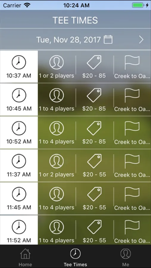 The app also support promotion code discounts with a deals section, course information and an account page to look up past reservations and share these reservations with your playing partners via text and email.