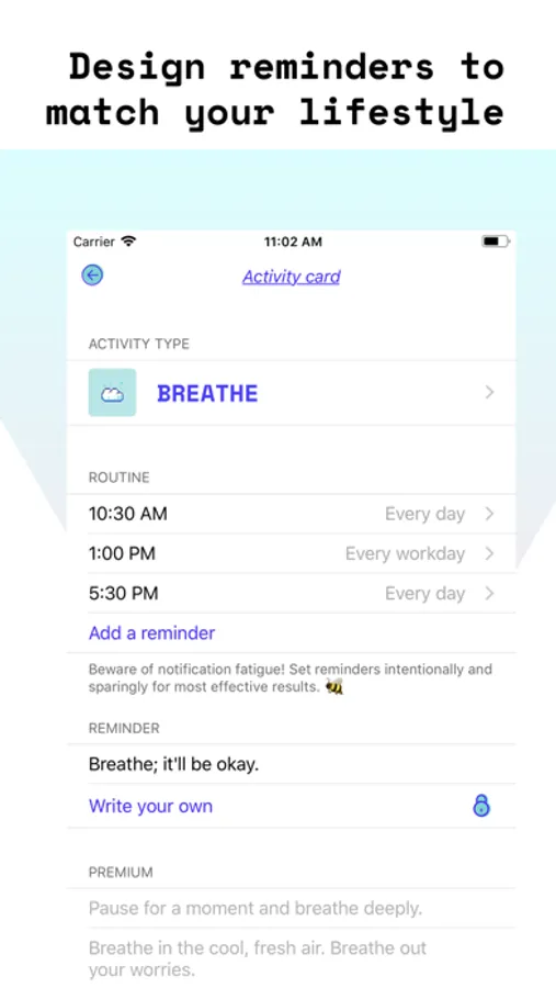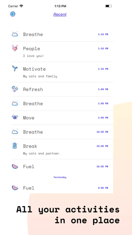 If you would like to enhance your experience and help support our growth, we offer in-app purchases. They allow you to add as many self-care activities, check in’s, journal, and activity log entries, as well as unlimited customization reminder schedules.