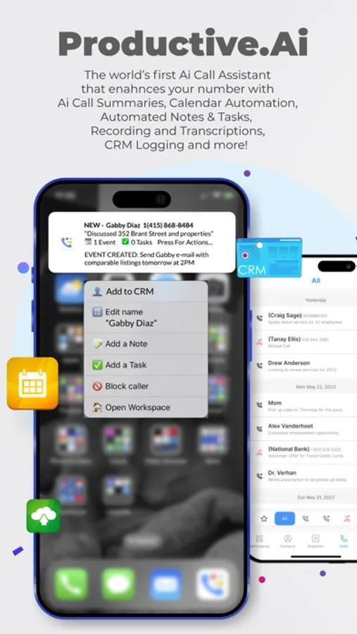 Productive's Ai is the first Ai Call Assistant that can transcribe your conversations in to a 50-word summary, while detecting important notes, assigning tasks, and even adding events to your calendar. And if you use a CRM, all of your customizable call details are logged automatically (Recordings, Transcriptions, Contact Details, etc.). All you need to do is Just Talk, Productive will do the rest!
