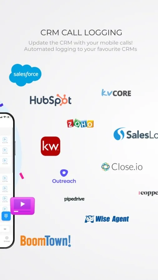 For the first time, retrieve CRM records for calls automatically and upload notes with a tap. Integrations with Salesforce, Hubspot, KW Comand, Wise Agent, KvCore, Boomtown, MS Dynamics, SalesLoft, Pipedrive, Close, Zoho, Copper, and more.
