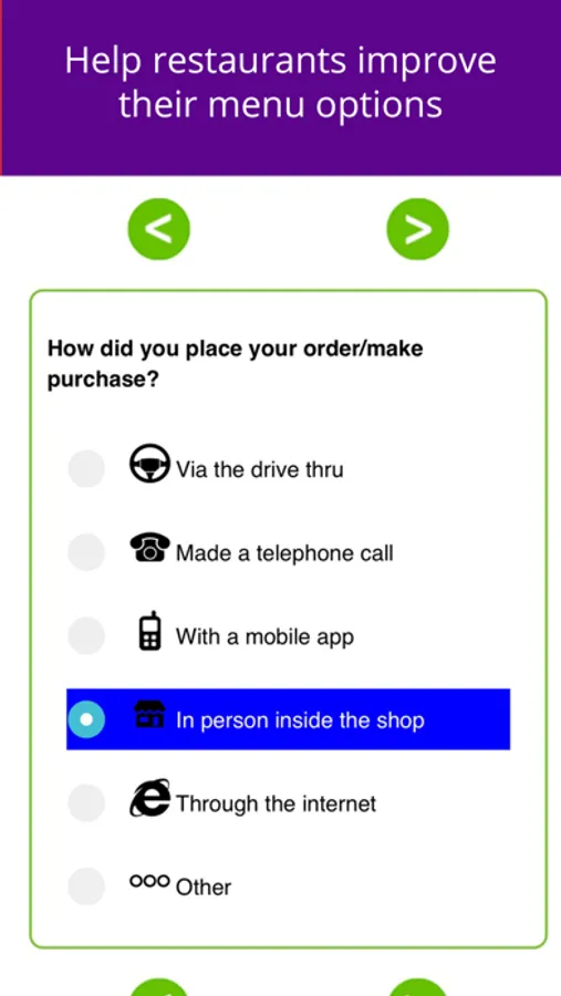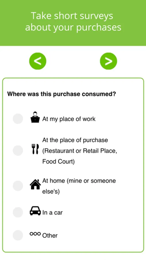 1) Use the SnapMyEats receipt survey located within the app to answer five short questions about your food or drink purchase.