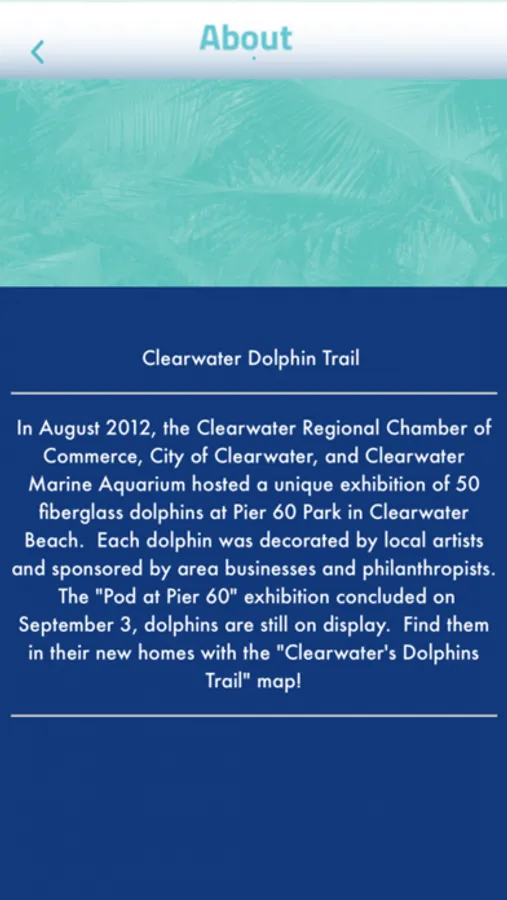 Our app showcases the entire Clearwater Dolphin Trail. We want newcomers and people who already live in our city to enjoy the enlightening path which is located throughout the heart of the city. Each Dolphin on the map represent an actual dolphin statue, in various locations to commemorate many historical and economic achievements bestowed upon our city. Thank you for exploring our city!