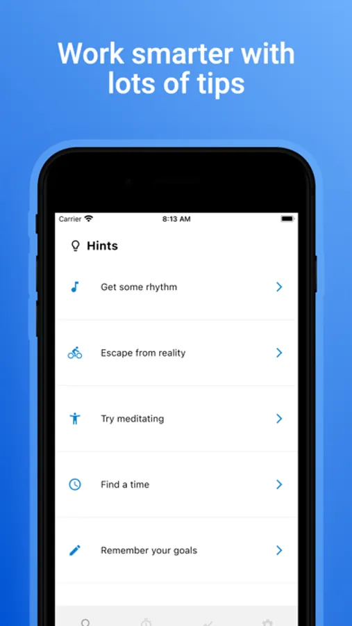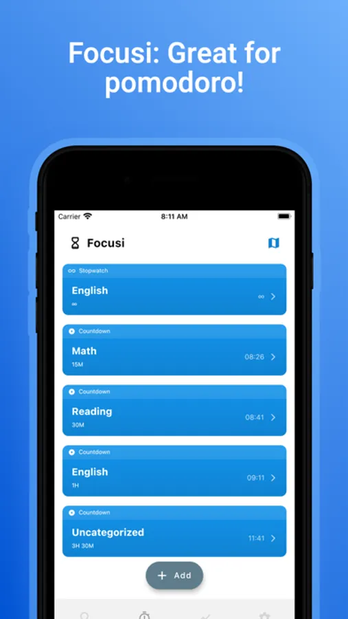 - Multiple time frames(15, 30, 60 minutes etc.) that can be added or removed freely. You can use these as pomodoro sessions or for breaks.