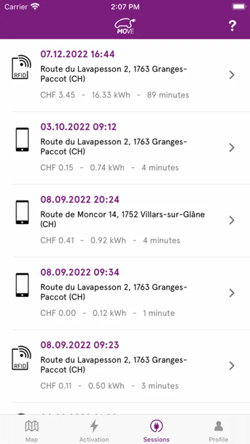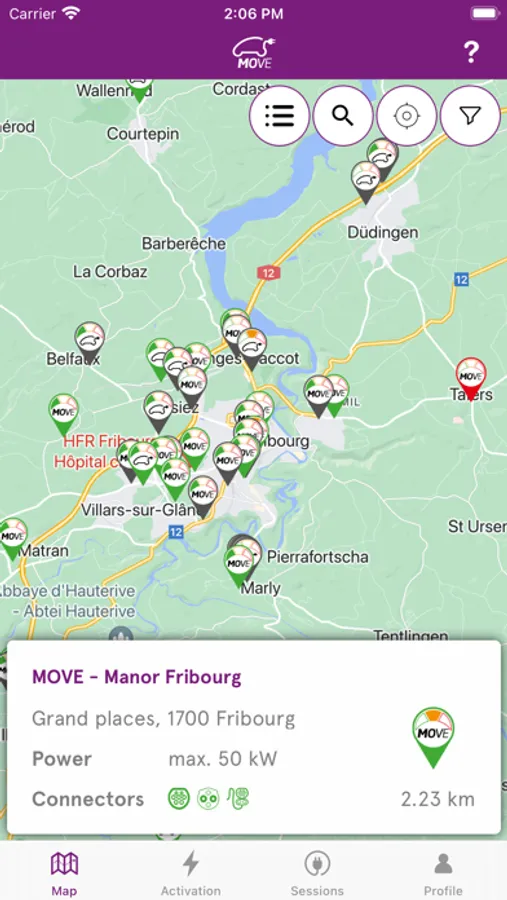 Find the next charging station by the quickest means thanks to the MOVE smart phone application. The MOVE application shows not only the charging stations of the Swiss charging network MOVE but also charging stations across Europe which are enable for roaming and can be activated by the MOVE RFID card.