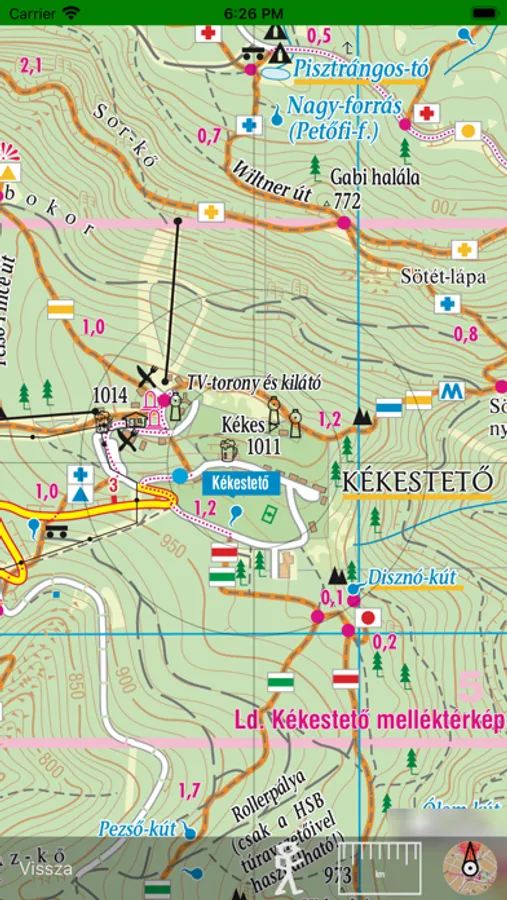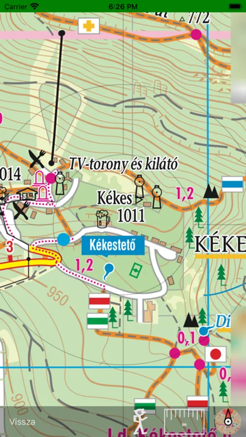 Az alkalmazás a GPS rendszer használatával a turista helyzetét pontosan mutatja.