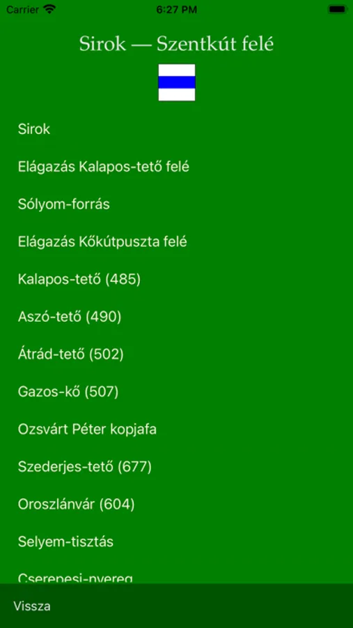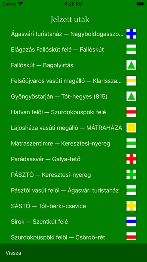 A kiválasztott jelzett út címsora alatt megjelenő turistaút-jelre tapintva az alkalmazás megmutatja az útvonalat („végig megy”) az úton. Az út bemutatását megállíthatjuk és folytattathatjuk ráduplázással illetve a rögzítés feloldásával. A rátapintáskor megjelenő „Vissza” gombbal leállíthatjuk az út bemutatását.