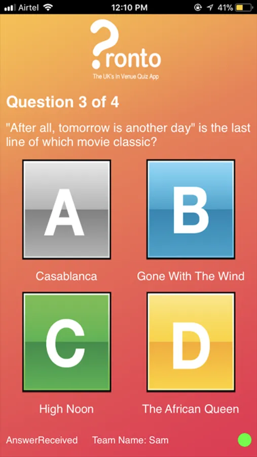 Pronto/?ronto has been developed by Mediatheme, the licensed and leisure industries’ No.1 choice for touch screen entertainment. Run in conjunction with the hugely popular best-selling Entertainer, Pronto provides pubs, clubs, entertainment venues, holiday camps and seaside hotels with a contemporary multi-player game. The app allows quiz participation by patrons at the venue where an Mediatheme Entertainer unit is installed.