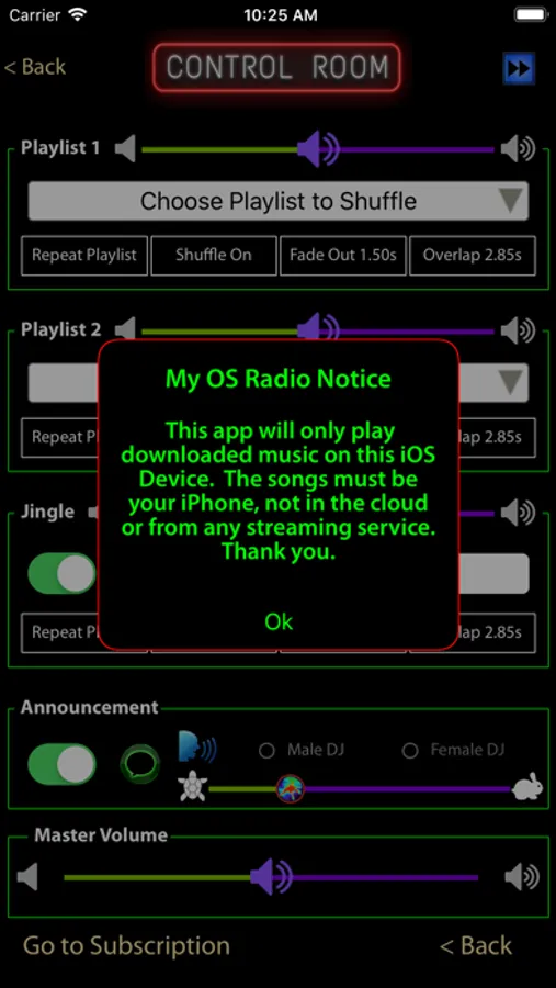 2. Go to the Control Room and select one or two playlists and tap "Back". Now you are " On The Air". The app is set to play your music, make time, temperature and interesting announcements right away with our official DJ, or a voice you choose.