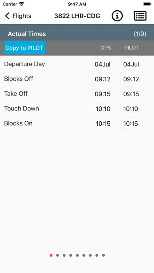 o Actual times (ATD/ATA and takeoff and landing times). Review and/or copy the Actual Times entered from Ops.