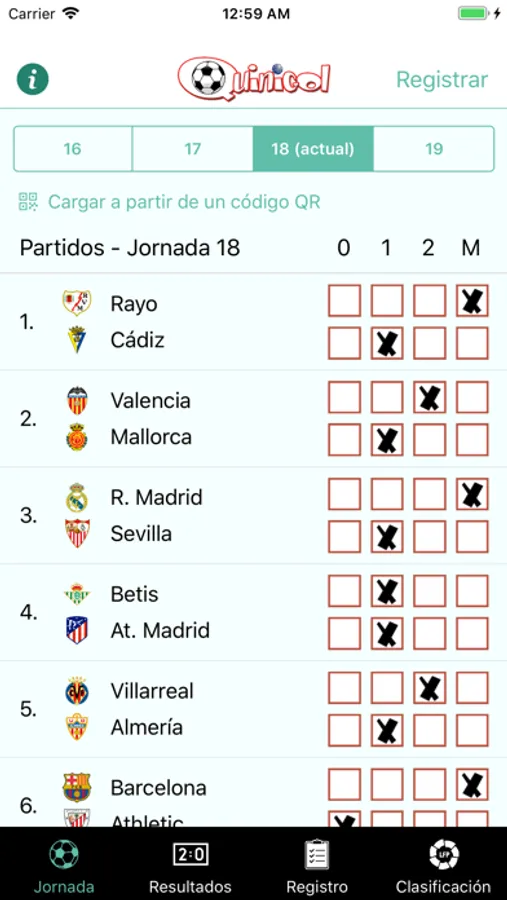 - Carga tu quinigol a partir del código QR generado en tu establecimiento de Loterías y Apuestas del Estado. Tan solo tienes que pulsar el botón correspondiente en la sección de Jornada y apuntar con la cámara de tu dispositivo al código