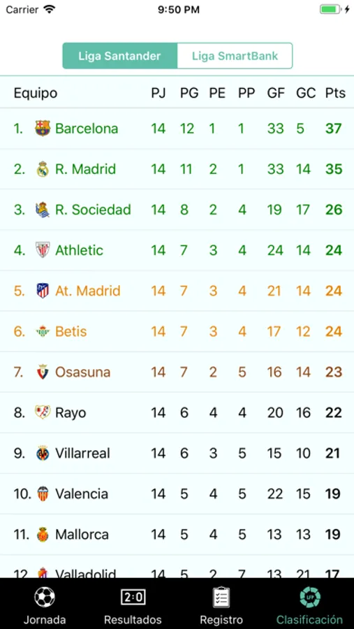 - Visualización de la clasificación de la Liga Santander y SmartBank junto a los equipos que están en posición europea, descenso o ascenso (este último para segunda división)