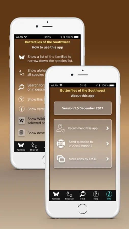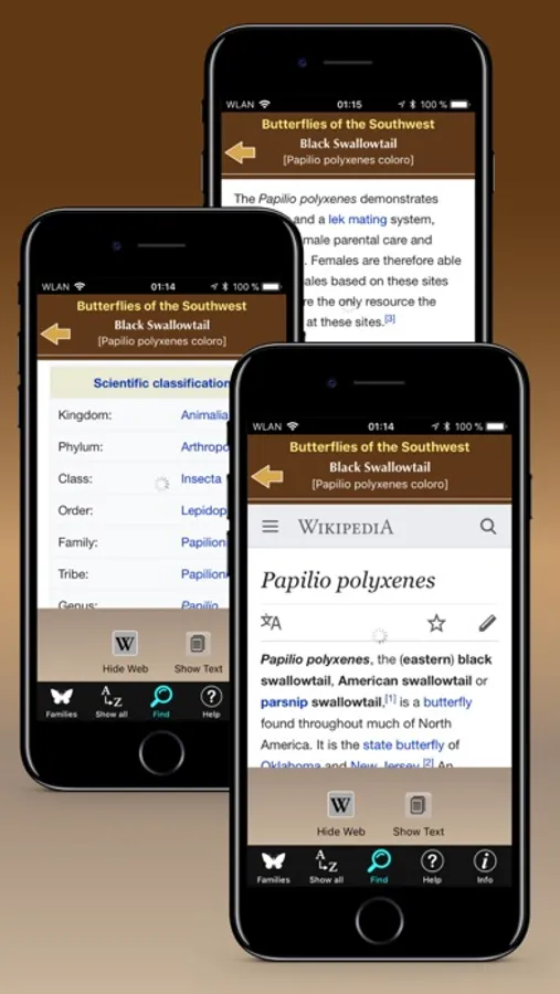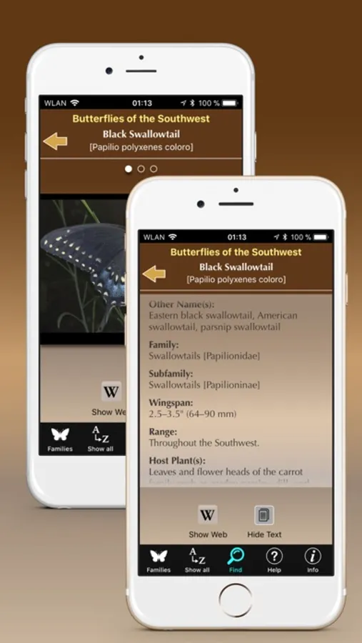 This app shows the 70 most common butterfly species found in the Southwest of the US. For each species there are three high-resolution pictures (also of the larvae, if available), a brief description of its size (wingspan), significant features, host plant(s), and flight season. Included is a link to view the corresponding Wikipedia pages within the application window. All descriptive information is in English, the butterfly species and family/subfamily names are also shown in scientific (Latin) nomination.