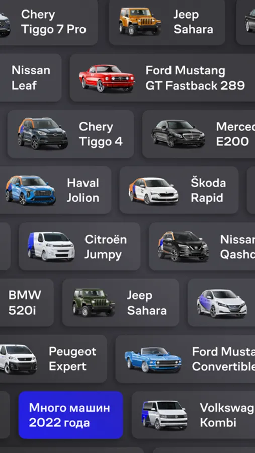 У нас около 16 000 машин 20-ти разных моделей. Есть эконом (Hyundai, KIA, Renault, Škoda, Genesis), бизнес (Audi, Mercedes, BMW), Джипы и электрокары, фургоны и микроавтобусы. Даже Мустанги 60-х годов.