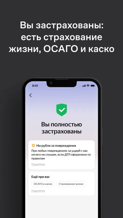 Есть ОСАГО, страхование жизни водителя и пассажиров на 2 000 000 ₽ и каско с франшизой «Виновника». С ней вы не заплатите больше 40 000 ₽ за ущерб обычной машины, 75 000 ₽ за особую и 150 000 ₽ за Джипы. А если взять каско без франшизы, то есть полное покрытие ущерба, то все риски мы возьмём на себя, и при любых повреждениях с вас вообще ничего не спишем, если ДТП оформлено верно. Так что в Драйве вы прикрыты со всех сторон.