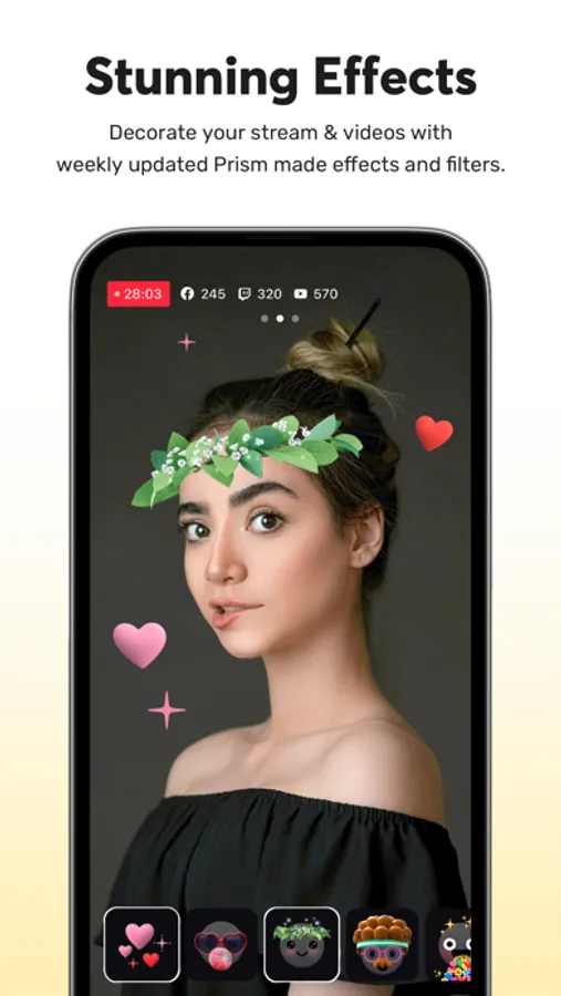 Spice things up with various effects like unique masks, background filters to change the mood, touch filters to show reactions, and stylish filters.
