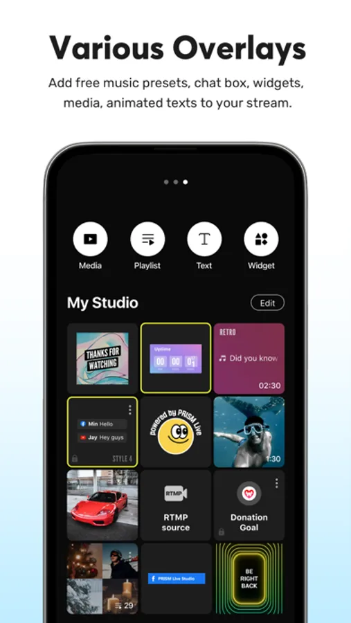 Add simple text overlays or choose an animated theme from Title, Social, Caption, and Element to decorate your live stream.