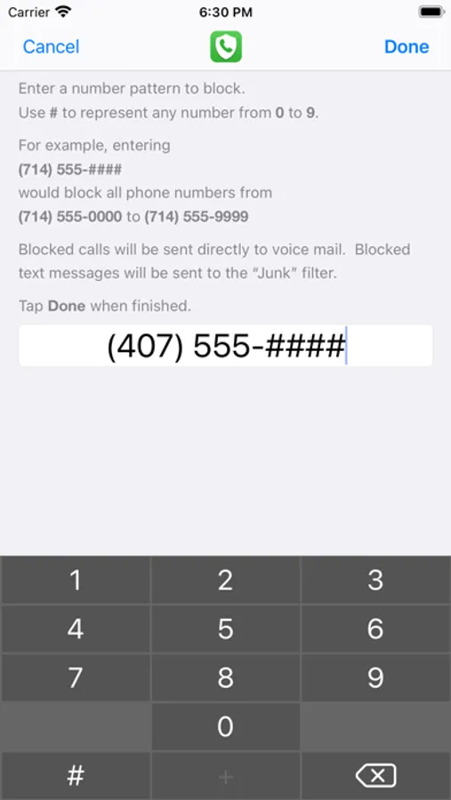 For example, if your number is 714-555-1234, scammers might use a number like 714-555-6789. Block all similar numbers by entering 714-555-####. Wildcards and numbers can be combined in any order you choose. Block international numbers, too!
