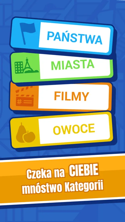 Słowa musisz zgadywać w ponad 30 kategoriach, które dzięki waszej pomocy ciągle będziemy ulepszać! Są wśród nich zarówno typowe dziedziny jak nazwy państw, miast, rzek, czy stolic, jak i tytuły filmów, seriali oraz gier.