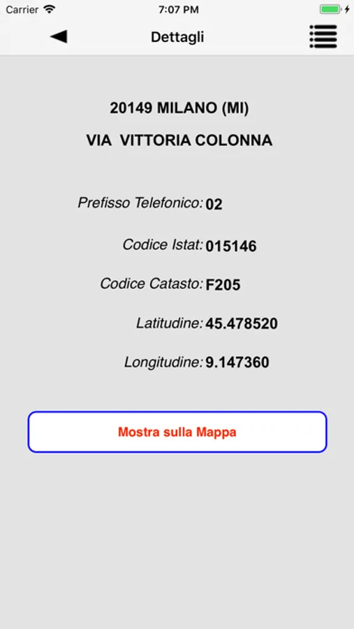 Dati aggiuntivi: Codice Istat, latitudine, longitudine, posizione sulla mappa, prefisso telefonico