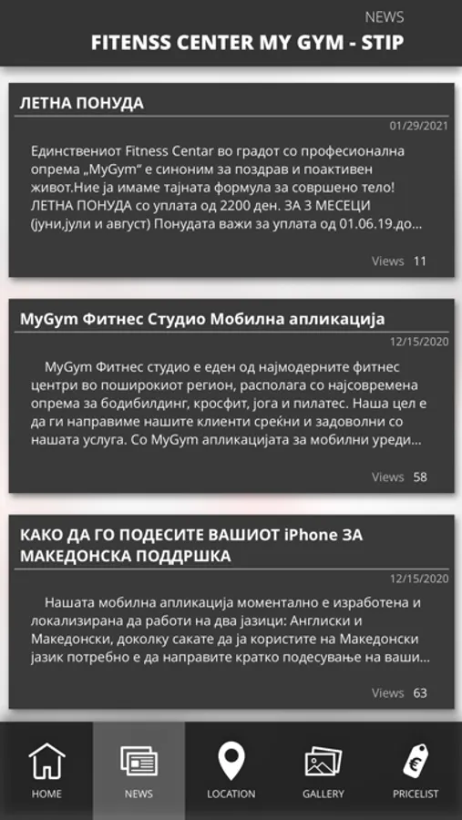 MyGym Stip Fitness Studio is fully equipped studio for bodybuilding, cross fit, yoga and pilates based in Shtip, Republic Of Macedonia. Our goal is to make our clients happy and satisfied of our service. Our mobile app is designed for our members to make the most of their membership. Members can view the latest studio news, view ongoing promotions and access member account information, as well as view the studio location and contact information.