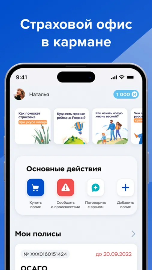 - получать уведомления и напоминания о сроке действия полиса для продления или оплате взносов