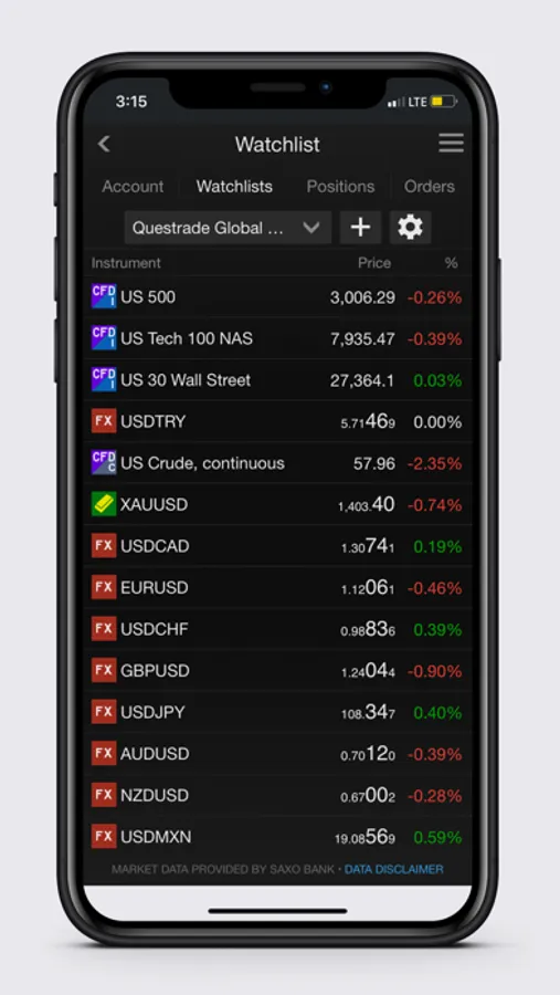 Questrade Global Mobile allows you to access the world’s largest financial market on the go. Whether trading global indices, stock CFDs, commodities or currencies, you’ll always be connected to your Questrade FX & CFD account.